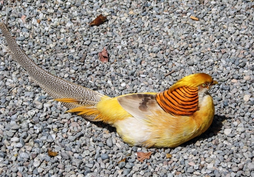 E' un fagiano giallo. Nelle isole Borromee, sul lago Maggiore, se ne trovano che si lasciano avvicinare, per la gioia dei fotografi. Grazie Giustina. |