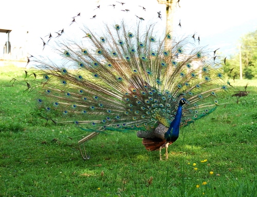 Tag: pavone, prato, uccello, ruota, erba, verde, occhi, animale, piume, coda, colori.