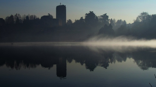 Tag: acqua, riflesso, alberi, fiume, nebbia, torre, lago, controluce, foschia.