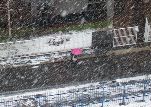 A me questa piace moltissimo... l'ombrello fucsia solo nella tormenta di neve! |