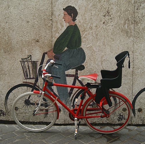 Tag: ruote, bicicletta, rosso, seggiolino, murale, murales, donna, pedali, nero, sella, manubrio, cestino, biciclette, muro, rossa, sellino, pedale, bici, raggi, disegno, strada, immagine, cavalletto.