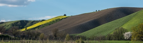 Altri tag (senza riscontro): terra, piante, curve, sinuosità, fiori, cime, bianco, strada, filari, terreni, celeste, panoramica, territorio, coltivazione, culture, ondulazioni, rami.