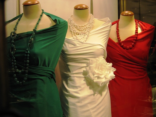 Tre abiti fanno un tricolore (vetrina di un negozio in centro a Milano).