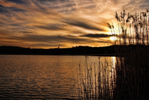 Tag: tramonto, nuvole, lago, canne, acqua, controluce, mare, cielo, sole.