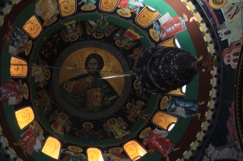 lampadario che scenda dal soffitto affrescato di questa piccola chiesa grecortodossa