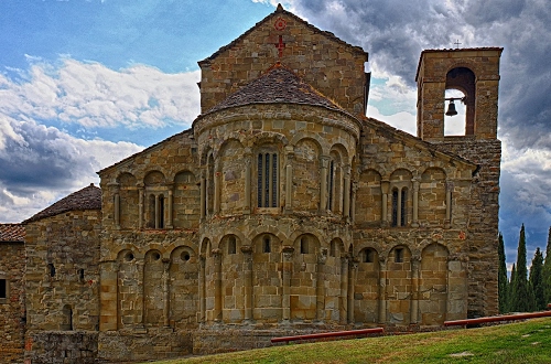 Tag: campanile, chiesa, cielo, abside, archi, nuvole, campana, alberi, colonne, erba, verde, bifore, pietra, prato, romanico, pieve, finestre, trifora, trifore, cipressi.