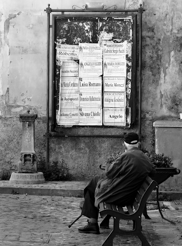Questa è una foto originale con la O maiuscola! Vedere l'anziano seduto sulla panchina con lo sguardo sui manifesti e con chissà quali pensieri, la rende unica, anche la scelta del bianconero è azzeccata. |