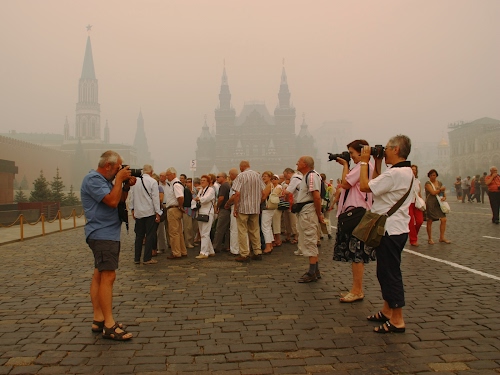 Piazza Rossa con nebbia di fuoco per incendio torbiere.