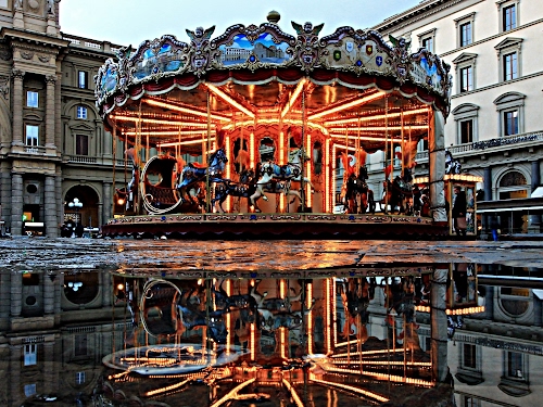Tag: giostra, palazzi, cavalli, luci, acqua, riflesso, finestre, piazza, riflessi, pozzanghera, cerchio, colonne, luce, case.