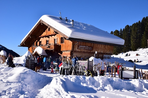 Tag: neve, rifugio, baita, tetto, inverno, bianco, sci, montagna, alberi, persone, finestre, legno, balcone, innevato, slitte, cielo, comignoli.
