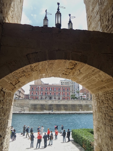 Il borgo antico di Taranto e la città nuova sono divisi da il canale navigabile che mette in comunicazione Mar Piccolo da Mar Grande. La ripresa è fatta dall'interno del Castello Aragonese.