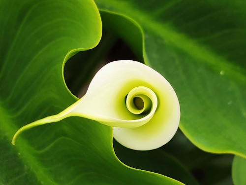 Nel mese di marzo a Campomarino di Maruggio nasce spontanea una calla avvolta dalle sinuose verdi foglie.