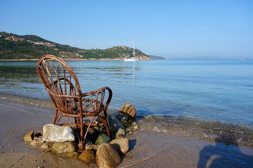 Sedia abbandonata sulla riva del mare di Sardegna