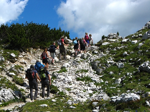 Tag: nuvole, montagna, persone, verde, rocce, cielo, sentiero, zaini, sassi, alberi, erba, camminare, salita, gruppo, pietre, gente, azzurro, trekking, fila, bastoni.