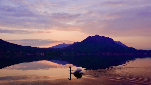 Un cigno solitario nuota sul lago di Garlate al tramonto
