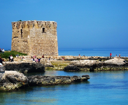 Tag: torre, mare, azzurro, scogli, cielo, persone, rocce, acqua, verde, orizzonte, bagnanti.