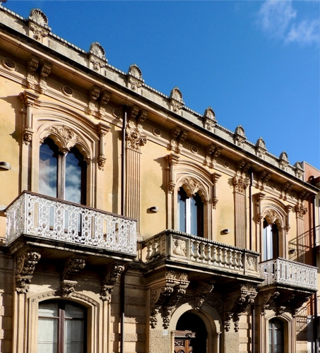 Tag: balconi, palazzo, finestre, tre, vetri, bifore, liberty, facciata.