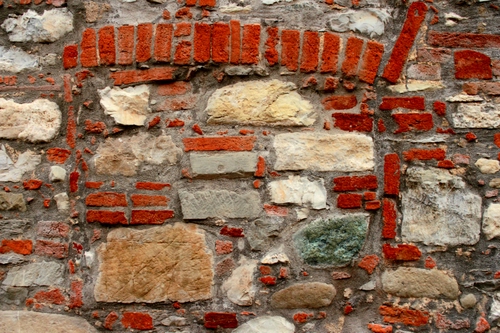Muro eretto con pietre e mattoni.