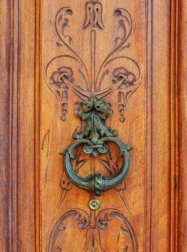 Tag: legno, porta, batacchio, battiporta, ferro, metallo, marrone, maniglia, floreale, verde, bronzo, ottone, decorazioni, portone.