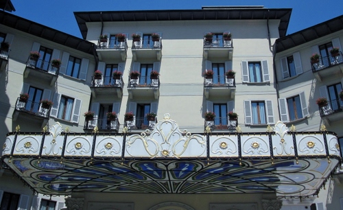 Il bianco e l'azzurro di una pensilina di un hotel a Stresa.