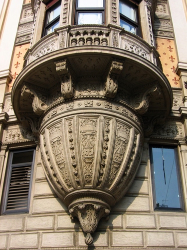 Balcone nella parte inferiore di un bovindo, in una casa in stile Liberty a Milano, nei pressi di Corso Buenos Aires.