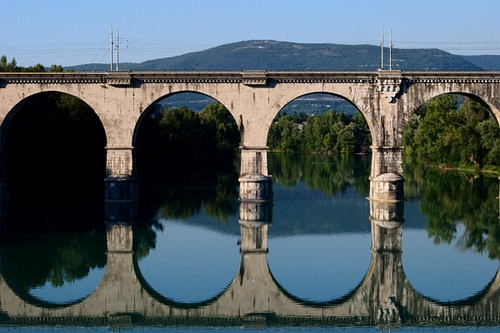 Il ponte ferroviario sull'Isonzo alle porte di Gorizia. Sullo sfondo il monte Sabotino |