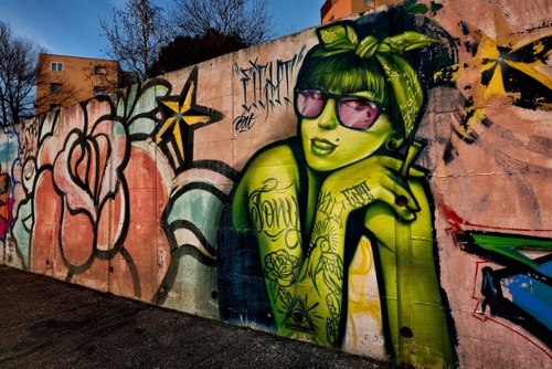 Tag: occhiali, muro, donna, murales, murale, stella, fiore, sigaretta, alberi, dipinti, palazzo.