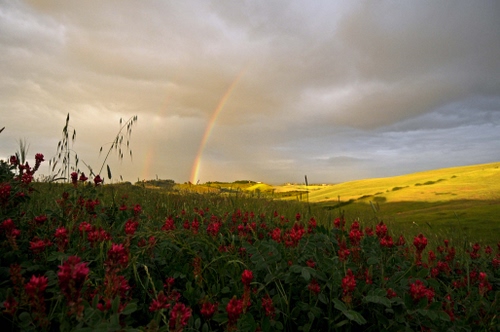 La classica foto piaciona, ben piazzata in Arcobaleno. Il punto forte dell'immagine - e anche molto valido - è di sicuro lo sprazzo dei campi illuminato dal sole e il doppio arcobaleno. Non sono male nemmeno le nuvole, anche se forse andavano scurite poco poco per creare ulteriore contrasto con la zona illuminata. Non mi piace molto invece la parte bassa, troppo scura, appesantisce tutto, nonostante la presenza dei fiori. Secondo me andrebbe tagliata una parte sotto e a sx del'immagine, per far posizionare l'arcobaleno secondo la regola dei terzi, bilanciando meglio la composizione. Percepisco un po' di rumore nel cielo, anche se non è troppo fastidioso. La saturazione è un filino troppo forte per il mio monitor. |