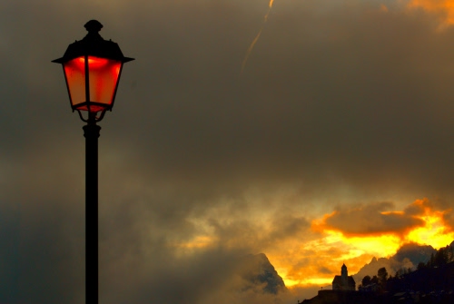 Tag: lampione, nuvole, tramonto, rosso, chiesa, montagna, cielo, sole.