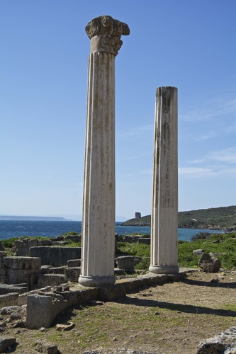 sito archeologico, Tharros nella penisola del Sinis, Sardegna, le sue colonne simbolo della città fenicio-punica.