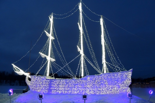 Nave realizzata nel ghiaccio e colorata con luce azzurra .