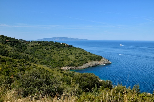 Costa dell'Argentario con sullo sfondo l'Isola del Giglio e il relitto della Concordia non ancora emerso completamente.
