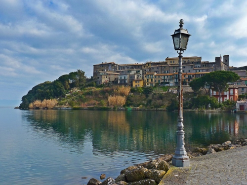 Tag: lampione, paese, riflesso, acqua, lago, mare, borgo, nuvole, alberi, cielo, case.