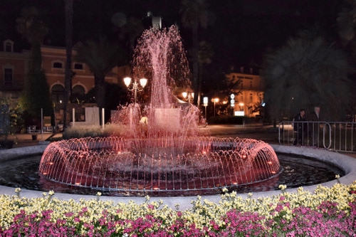 Tag: fontana, acqua, fiori, zampilli, notturno, notte, luci, rosso, alberi, lampioni, rosa, aiuola.