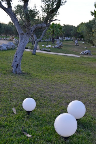 Tag: alberi, sfere, erba, prato, bianco, tre, verde, palle, lampioni, rami, ulivi, albero, pietre, lampade, parco, cielo.