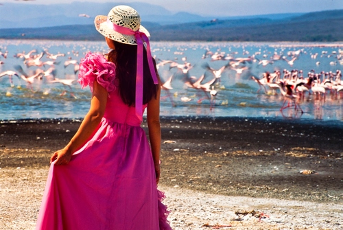 Molto bella la ragazza in rosa in tinta con i fenicotteri sullo sfondo. |