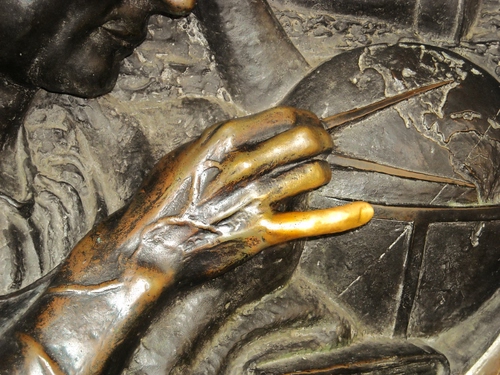 Particolare di bassorilievo raffigurante Cristoforo Colombo, a Torino; si dice che sfregare il dito mignolo di questa mano porti fortuna, soprattutto agli studenti che devono affrontare un esame