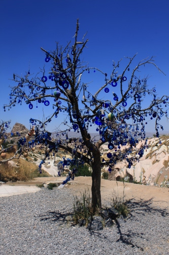 Alberello a cui sono appesi i cosiddetti "occhi di Allah", ciondoli ritenuti portafortuna. Fotografato in Cappadocia (Turchia).