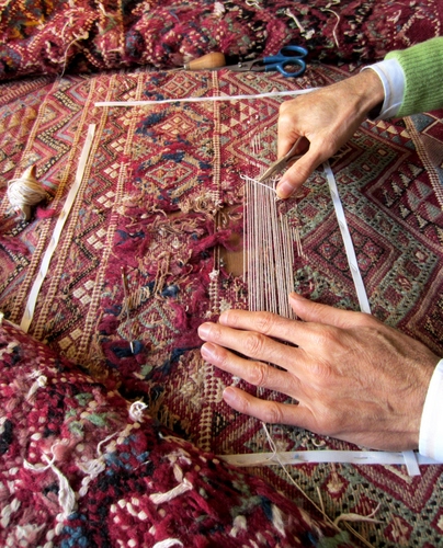 Un artigiano iracheno che ripara i tappetti antichi