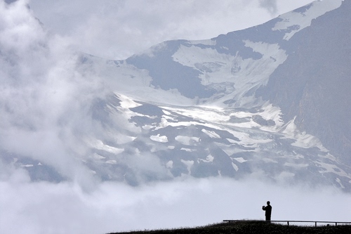 una distesa di neve e ghiaccio si intravvede tra le nebbie sui pendii del Grossglockner in Austria