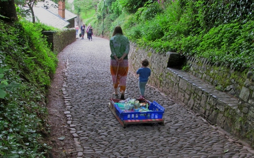 Un metodo per trasportare la spesa nel paese di Clovelly, in Inghilterra, in forte pendenza e con traffico assolutamente off-limits