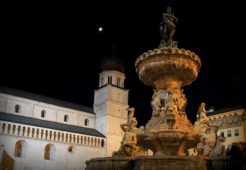 Tag: fontana, notte, luna, notturno, statue, chiesa, finestre, campanile, duomo, palazzo, buio, trento, piazza, torre.