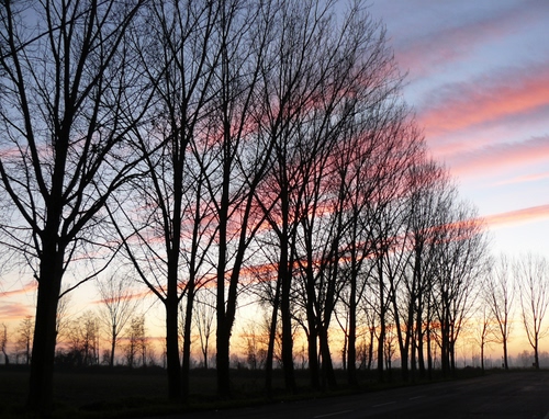 Tag: tramonto, alberi, nuvole, controluce, cielo, inverno, spogli, alba, rosa.