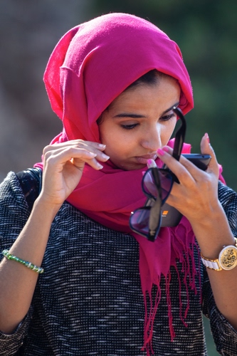 Una donna marocchina che è un po' l'immagine delle contraddizioni, spero evolutive, che quel popolo sta vivendo: con il foulard imposto dalla traizione, ma con unghie laccate, trucco, telefonino, occhiali da sole accessori tipici di una donna europea.