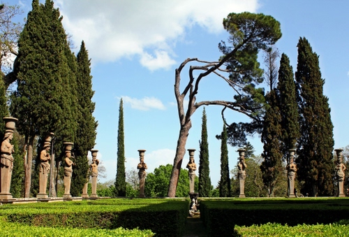 Tag: alberi, statue, giardino, verde, parco, cipressi, siepe, cielo, prato, rami.