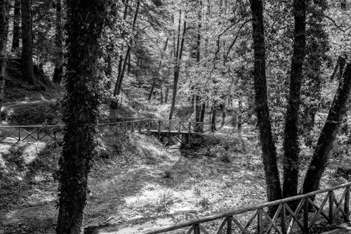 Tag: alberi, bosco, foglie, rami, bianconero, staccionata, tronchi, ponte, staccionate, sentiero, legno, piante.