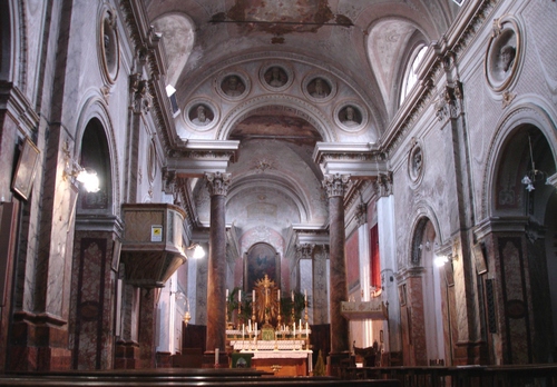 Una chiesa sobria , anche se piena di marmi e dipinti.