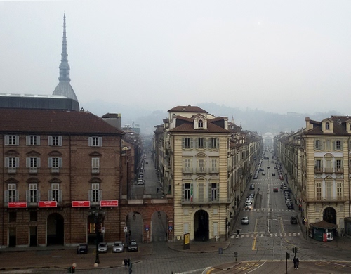La visuale è da Palazzo Madama,lato medioevale, quello col fossato, la via che taglia la foto è Via Po, al fondo si distingue la Gran Madre ![]() |