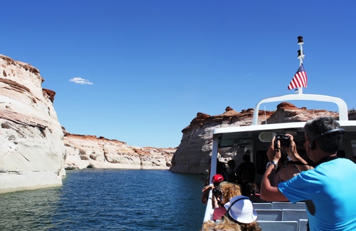 Entrando in un fiordo del Lake Powell, formato dal fiume Colorado, tutti i gitanti scattarono molte foto per le straordinarie colorazioni delle rocce.