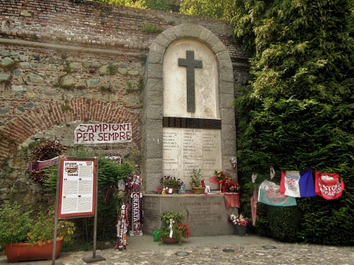 ...sul muraglione posteriore orientale del complesso architettonico di Superga dove si schiantò, il 4 maggio 1949, l'aereo che riportava a casa la squadra del Torino. I segni dell'impatto dell'aereo sono ancora visibili oggi su parte del muraglione, non più ricostruito dopo l'incidente.